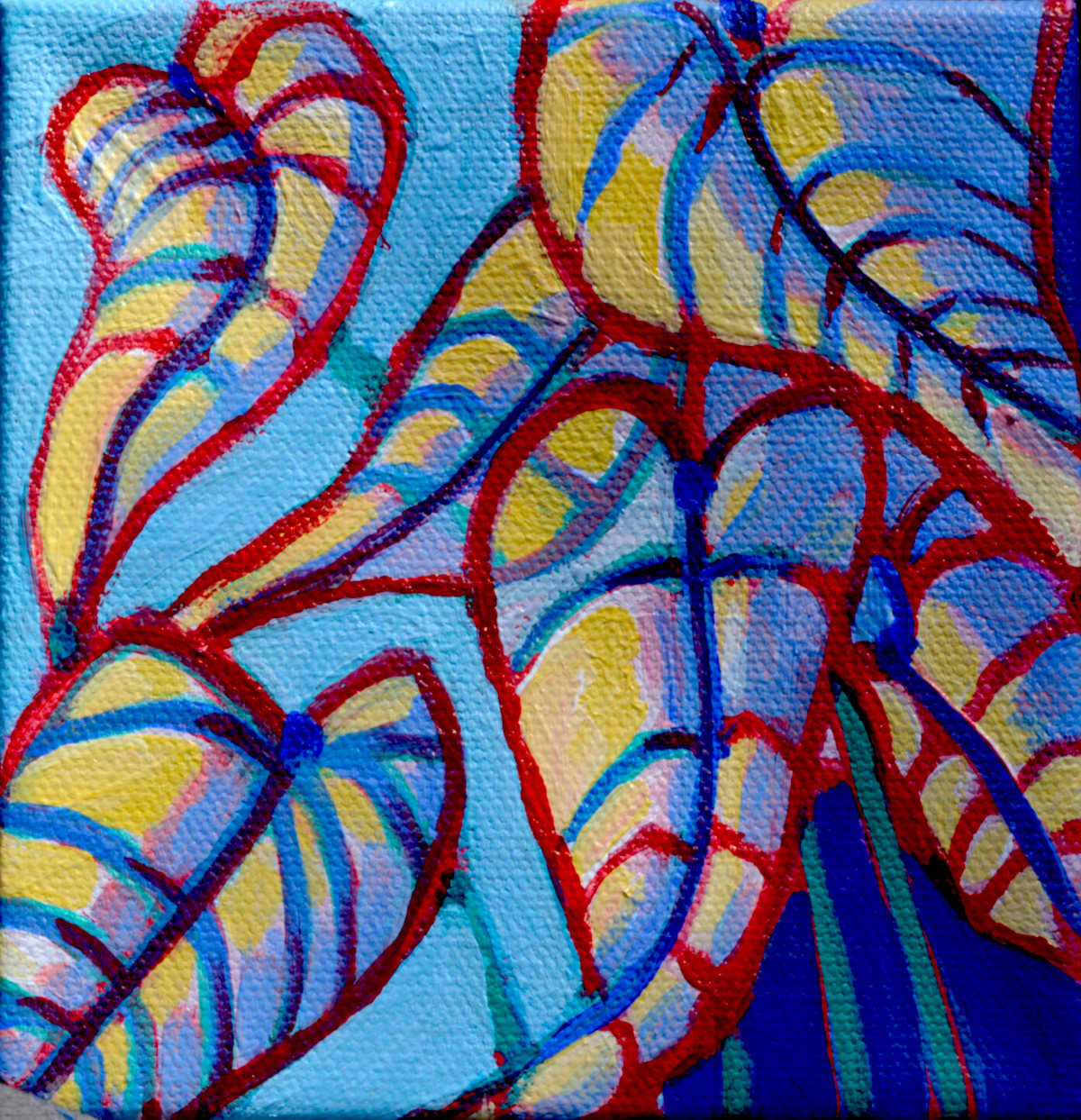 This mini painting is the third in the series of Spring-related, colorful, botanical still lifes I created in 2026 filled with a sense of joy and rebirth. I was inspired by friends’ and relatives’ plants they had on the windowsills of their homes. Each one became a mini window into their homes and lives, showing us one element of what they feel makes a house a home.   I call it this scene the “ghost plant” because it is very translucent, yet still present. Painted in acrylic on canvas, this artwork features vibrant tones on translucent leaves and strong outlines.