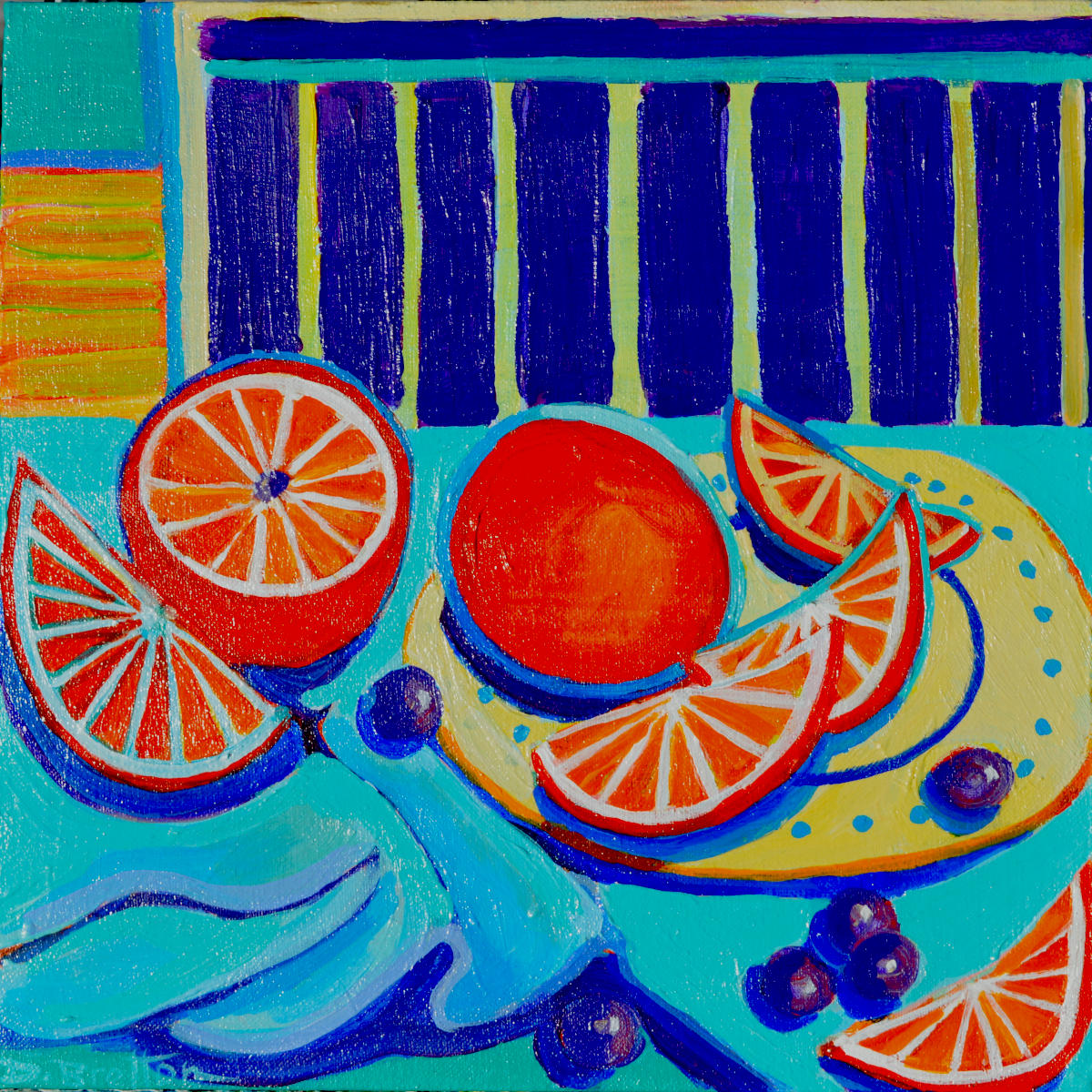 “Juicy Fruits”, acrylics on canvas, 12″ x 12″, original painting (one-of-a-kind), $500.00