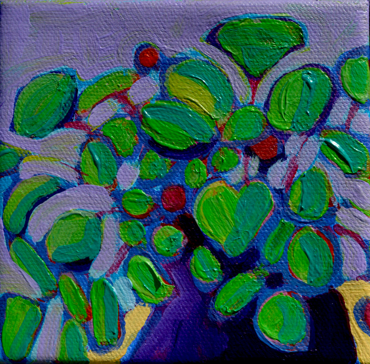 A colorful, slightly abstracted botanical still life in an interior projects joy and life. The green leaves of the plant are contrasted by the lavender color in the background. It is placed in a dark purple vase and sits on top of a creamy yellow table. The small painting is punctuated by 3-4 strategically placed red berries.