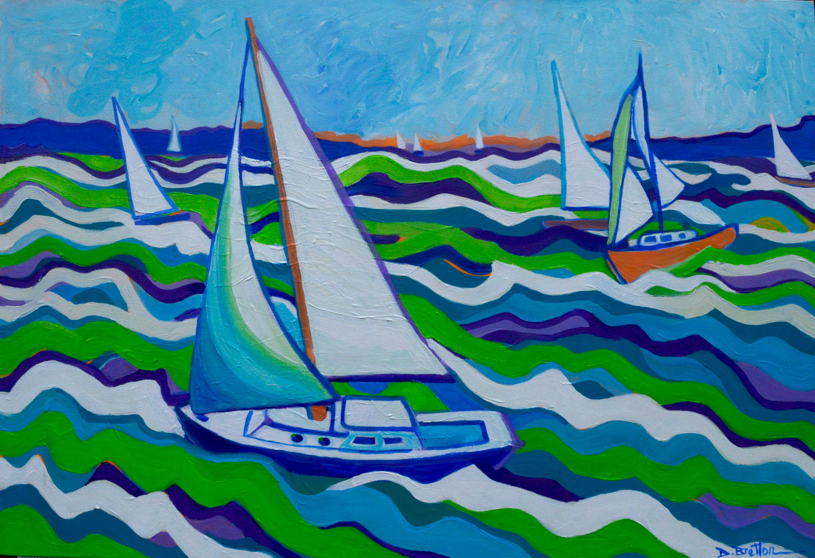 Sailboats in Manchester by-the-sea, Massachusetts glide on a vibrant, wavy sea with a variety of colors blending into the sky. The scene is energetic and dynamic, capturing the movement and rhythm of the water. Manchester by-the-sea is one of our family haunts; great for fishing, sailing, beaching, picnicking and painting. Our kids grew up going there. It’s fabulous!